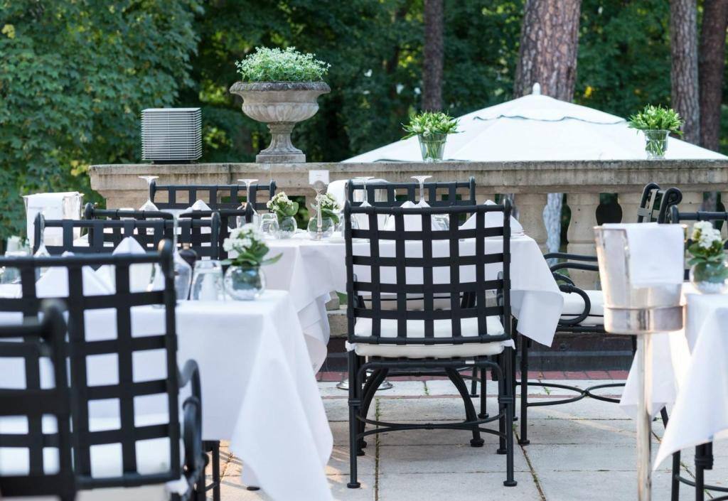 The complex not only offers top-tier amenities, such as fine dining restaurants, a gym, and a spa, but also boasts a variety of iconic spaces suitable for any event. These include a historic “Wintergarden” room with hand-painted ceiling murals, a sumptuous “Musikzimmer” music hall, and floor-to-ceiling wood paneling in both the library and the chandelier-lit restaurant.